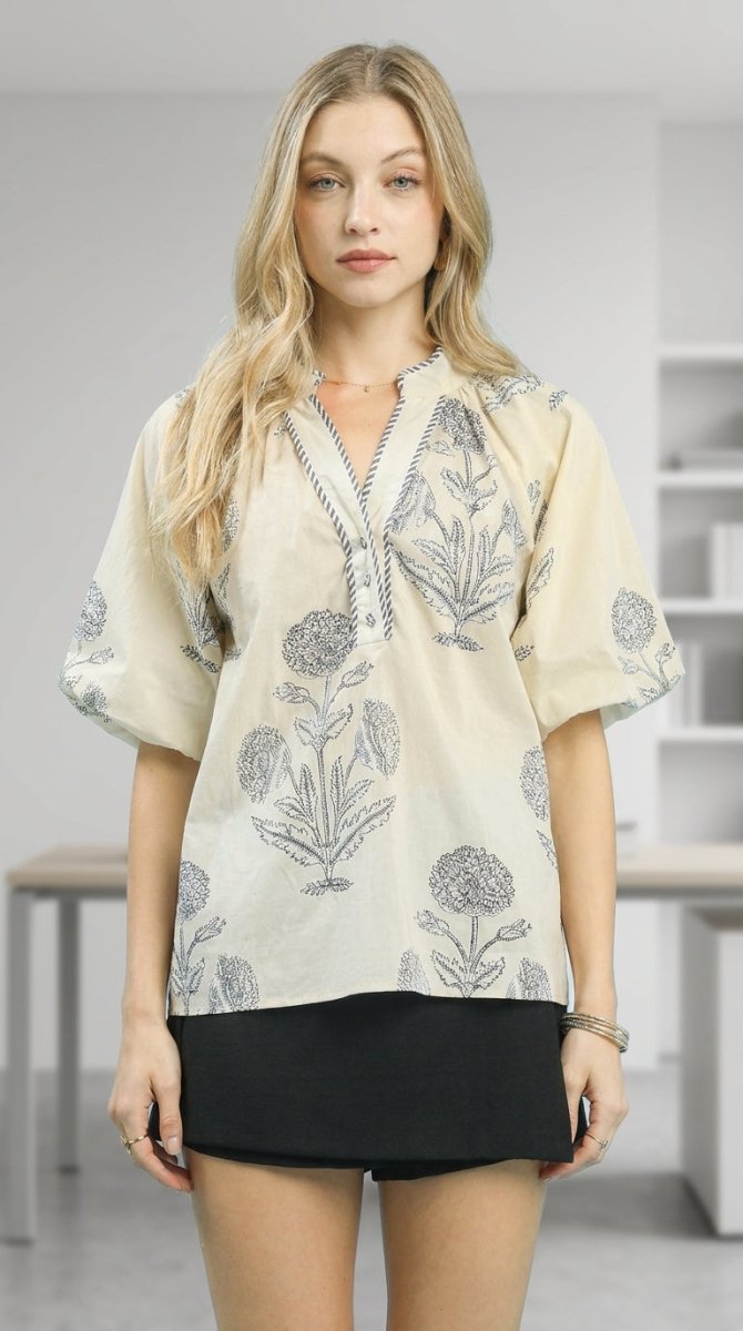 This women's cotton floral print blouse offers a fresh and feminine take on everyday fashion. Crafted from 100% cotton, it delivers breathable lightweight comfort ideal for warmer seasons or layered styling. The blouse features a flattering V-neckline enhanced with a striped trim detail, creating a subtle contrast that elevates its visual appeal. Designed with short puff sleeves, it forms a soft feminine silhouette that pairs well with casual or office attire. Whether you’re dressing for a relaxed weekend outing or a casual day at work, this blouse fits seamlessly into your wardrobe, providing easy styling versatility and all-day wearability.