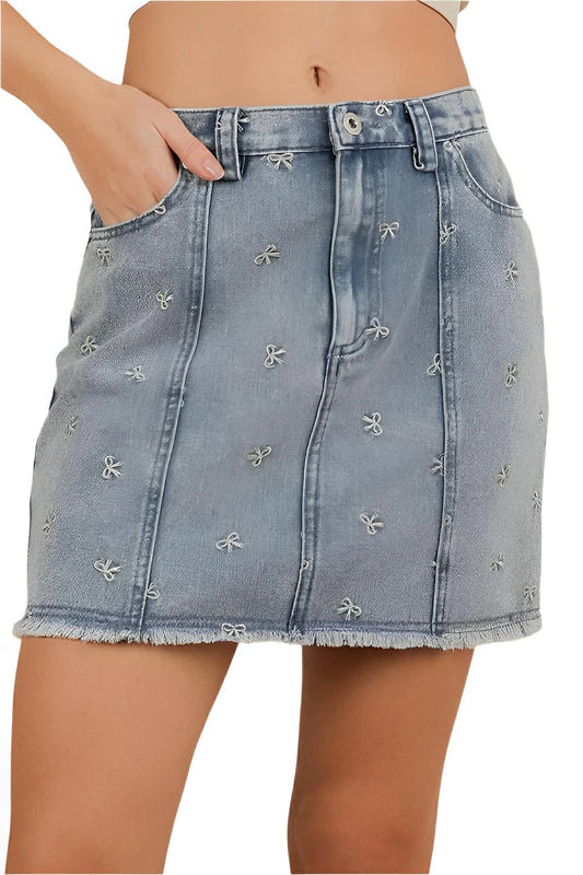 Bow Print Casual Denim Mini Skirt – Embroidered Raw Hem Style
